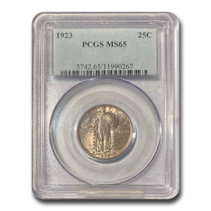 This 1923 Standing Liberty Quarter has been certified as MS-65 by PCGS, one of the top two coin grading services. This highly collectible coin is a great addition to any numismatic collection!