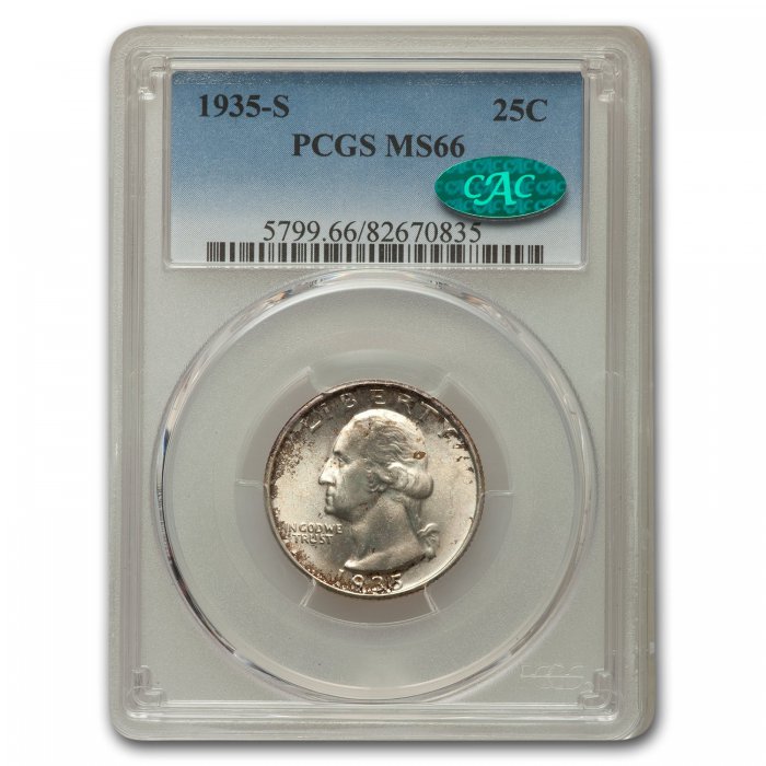 Only $545.00 per coin This 1935-S Washington Quarter has been certified as MS-66 by PCGS, one of the top two coin grading services. This highly collectible coin is a great addition to any numismatic collection.