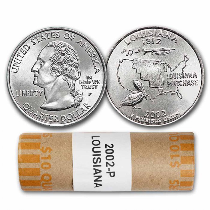This is the eighteenth coin released in the 50 State Quarter Program. The reverse of this coin depicts an image of a pelican, a trumpet with musical notes and the outline of the Louisiana Purchase in 1812.