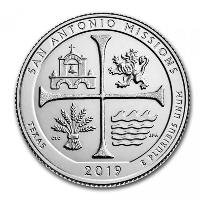 - Reverse: This design recreates the style of a Spanish colonial real coin and includes a mission bell tower to symbolize community, a lion for Spanish heritage, wheat for farming and waves of water to symbolize the San Antonio River. A cross in the middle separates each symbol and is surrounded by the inscriptions "San Antonio Missions", "Texas", "E Pluribus Unum" and "2019".