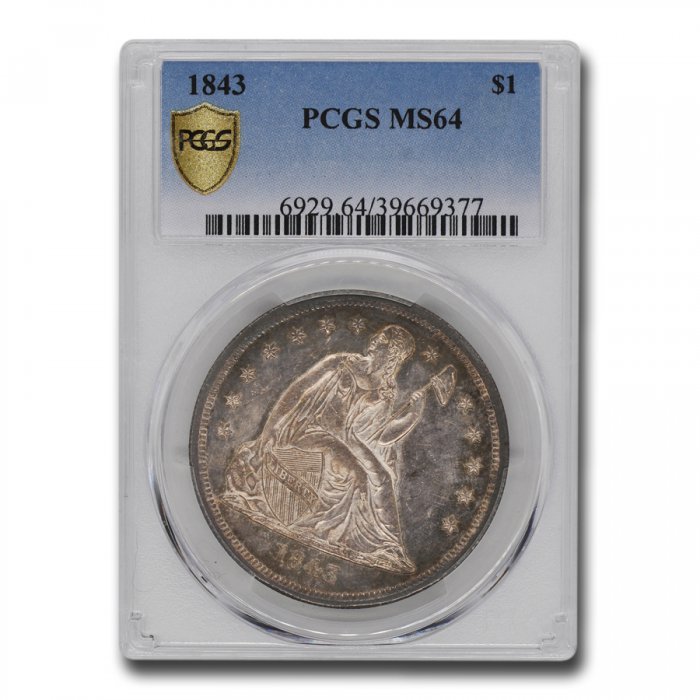 This 1843 Liberty Seated Dollar has been certified as MS-64 by PCGS, one of the top two coin grading services.