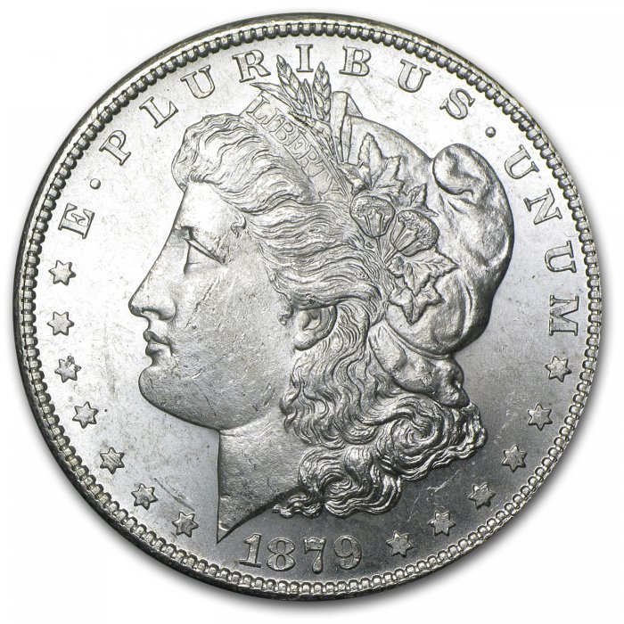 Scarce 1879-S Morgan Silver Dollar with the Reverse of 79 in Brilliant Uncirculated condition. The Reverse of 1879 Dollar has a Slanted Top Arrow Feather and a Convex Eagle Breast.