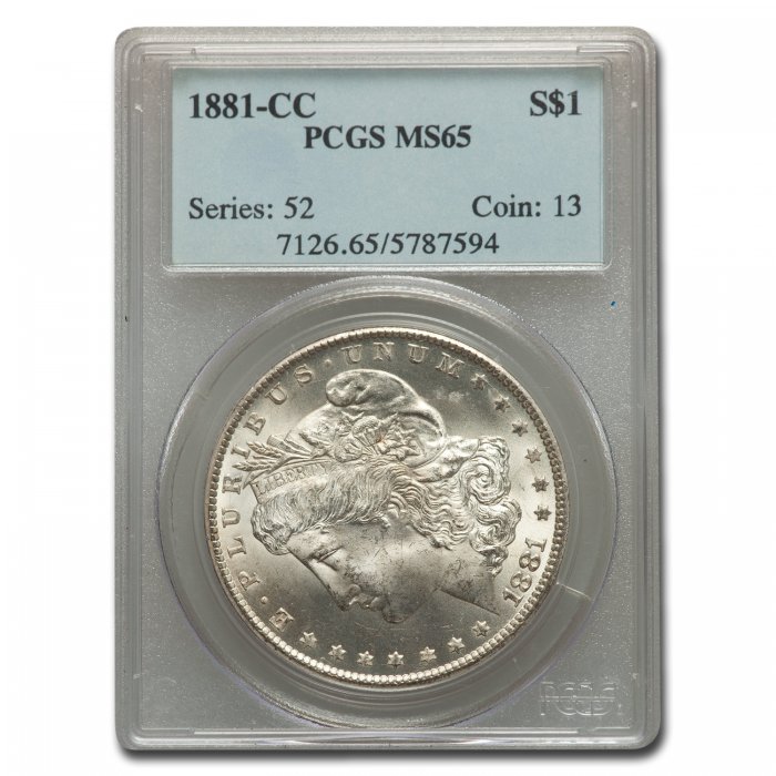 This 1881-CC Morgan Dollar has been certified as MS-65 by PCGS, one of the top coin grading services. This highly collectible coin is in great condition and will be an excellent addition to any numismatic collection.
