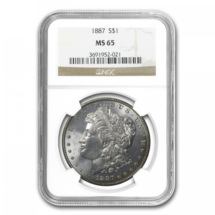 George T. Morgan's beloved design first used in 1878 has become one of the most collected images on all of American coinage. This 1887 Morgan Dollar has been graded and guaranteed by NGC as being MS-65.