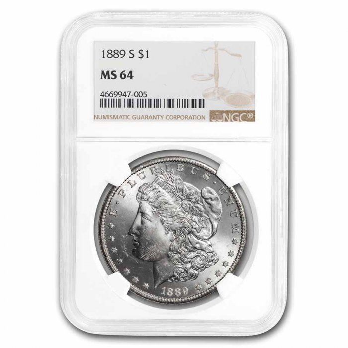This 1889-S Morgan Dollar has been certified as MS-64 by NGC, one of the top two coin grading services. This highly collectible coin is a great addition to any numismatic collection!
