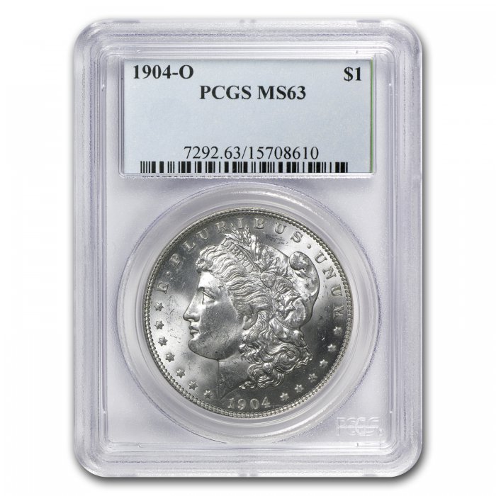 The Morgan Silver Dollar is the most popular Silver dollar collected in the world for its beautiful, classic design. This 1904-O Morgan Dollar has been graded and guaranteed by PCGS as being MS-63.