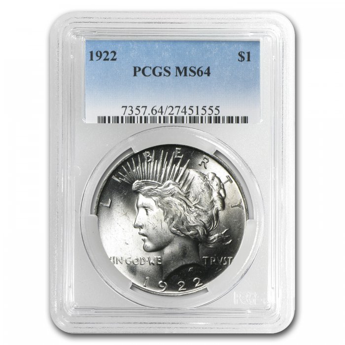 The Peace Dollar was created to symbolize the peace after WWI. This 1922 Peace Dollar is graded and guaranteed as an MS-64 by PCGS and encapsulated in a sealed holder to protect your investment.