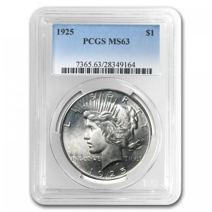 The Peace Dollar was created to symbolize peace after WWI. This 1925 Peace Dollar is graded and guaranteed as an MS-63 by PCGS and encapsulated in a sealed holder to protect your investment.
