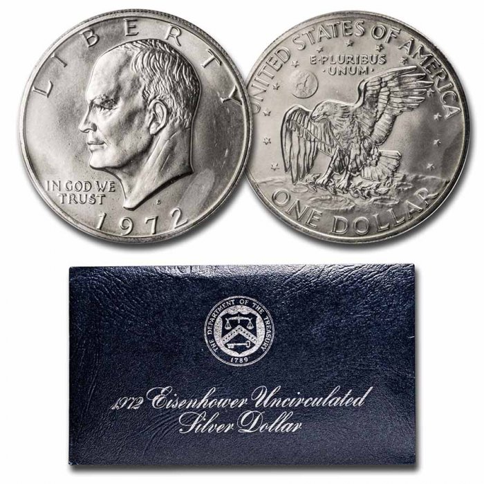 - All coins are housed in their original soft pack mint packaging and their issued certificate, inside the original Department of the Treasury Eisenhower Uncirculated Silver Dollar blue envelope.