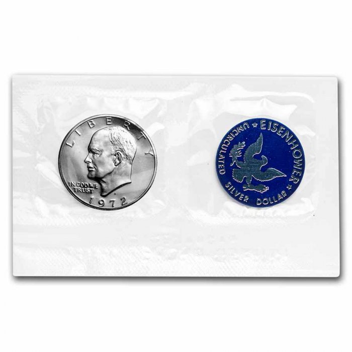 - All coins are housed in their original soft pack mint packaging and their issued certificate, inside the original Department of the Treasury Eisenhower Uncirculated Silver Dollar blue envelope.