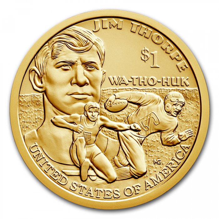 Reverse: Depicts Thorpe with the foreground highlighting his football and Olympic achievements.