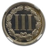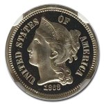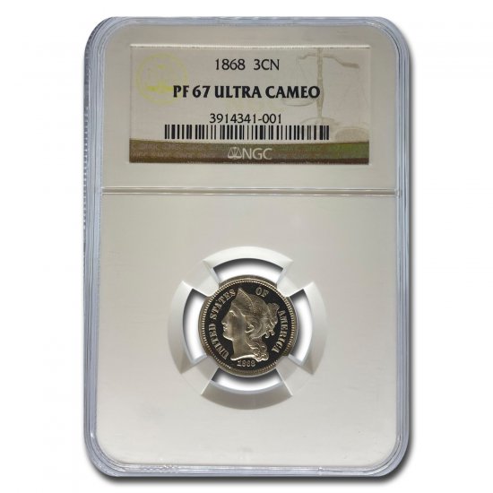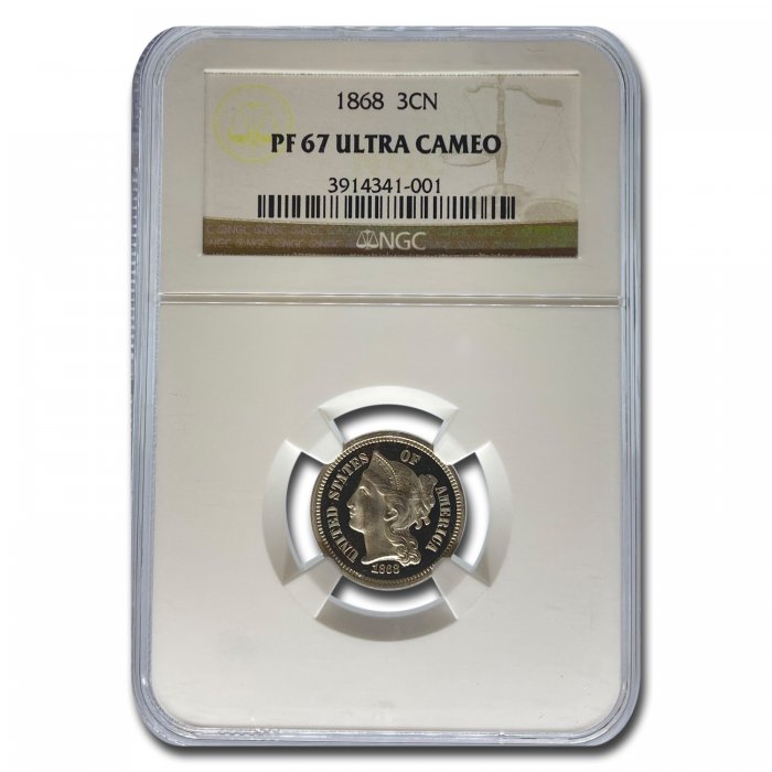 This 1868 Three Cent Nickel has been certified as PF-67 UCAM by NGC, one of the top two coin grading services. This coin has a population of only 6 coins!