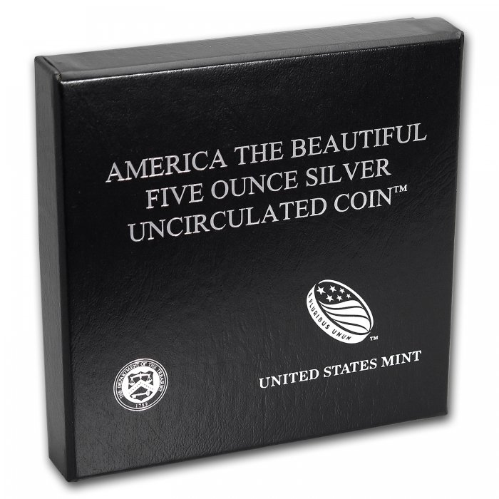 This presentation box adds security and visual appeal to your U.S. Mint 5 oz America the Beautiful Silver coin. Add this official U.S. Mint box for the 5 oz Silver America the Beautiful series to your cart today!