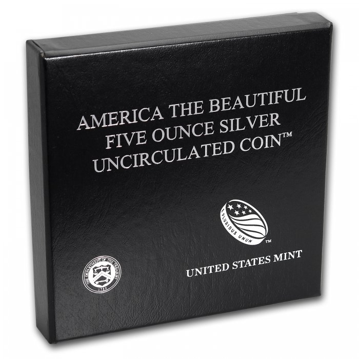 This presentation box adds security and visual appeal to your U.S. Mint 5 oz America the Beautiful Silver coin. Add this official U.S. Mint box for the 5 oz Silver America the Beautiful series to your cart today!