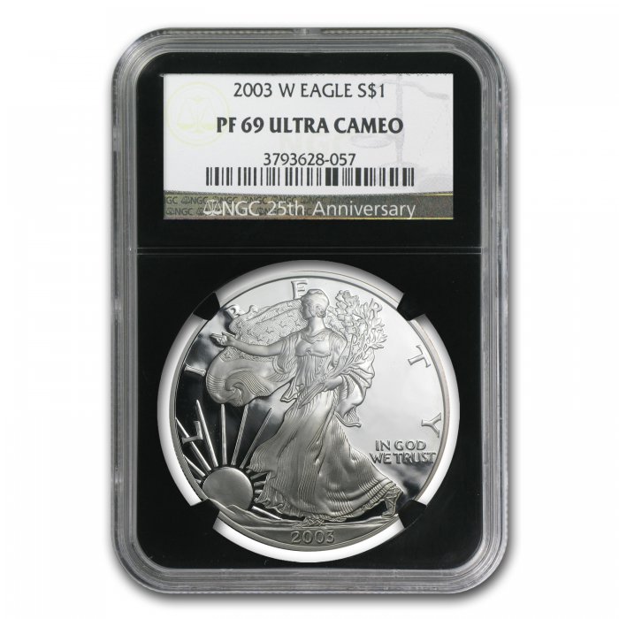 Since 1986, the Silver American Eagle has been the most popular Silver coin in the United States. This example has been certified by NGC, one of the top coin grading services, adding collectible appeal to the classic design and .999 fine Silver content.