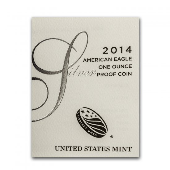 Classic blue velour clamshell-style, this original U.S. Mint presentation box will hold one Proof Silver American Eagle dated 2014 and includes the certificate of authenticity. Coin is sold separately.