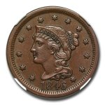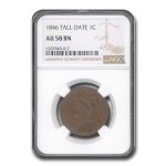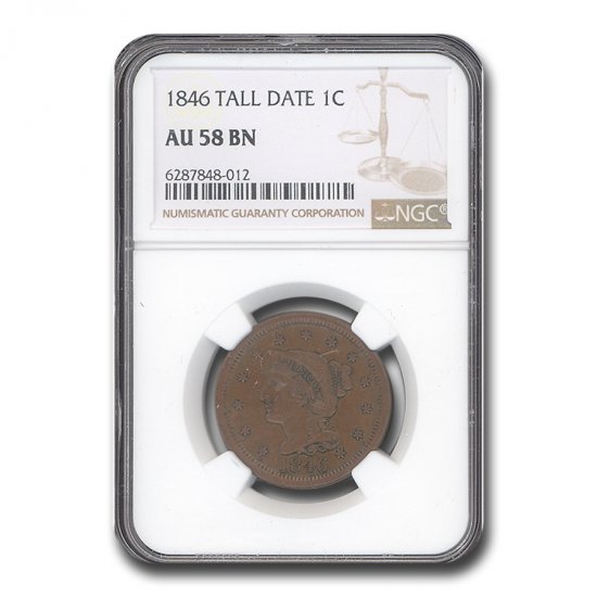 This 1846 Large Cent (Tall Date) has been certified as AU-58 (Brown) by NGC, one of the top two coin grading services. This coin has a population of only 55 coins!