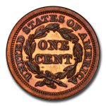This 1856 Large Cent (Slanted 55) has been certified as PR-66 (Red/Brown) by PCGS, one of the top two coin grading services. This coin has a population of only 4 coins!
