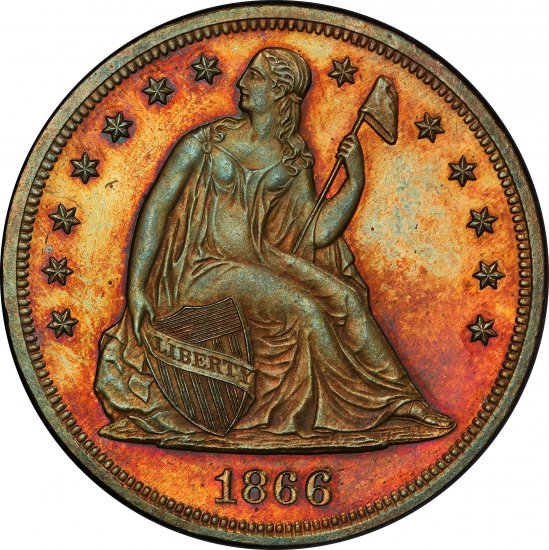 This 1866 Liberty Seated Dollar Pattern (J-541) has been certified as PR-65+ (Brown) by PCGS, one of the top two coin grading services.