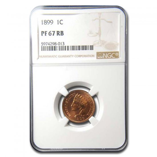 This 1899 Indian Head Cent has been certified as PF-67 (Red/Brown) by NGC, one of the top two coin grading services. This coin has a population of only 6 coins!