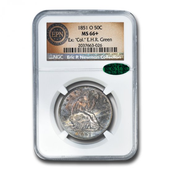 This 1851-O Liberty Seated Half Dollar (EX: Col. E.H.R.) has been certified as MS-66+ by NGC, one of the top two coin grading services. This coin has a population of only 1 coin!