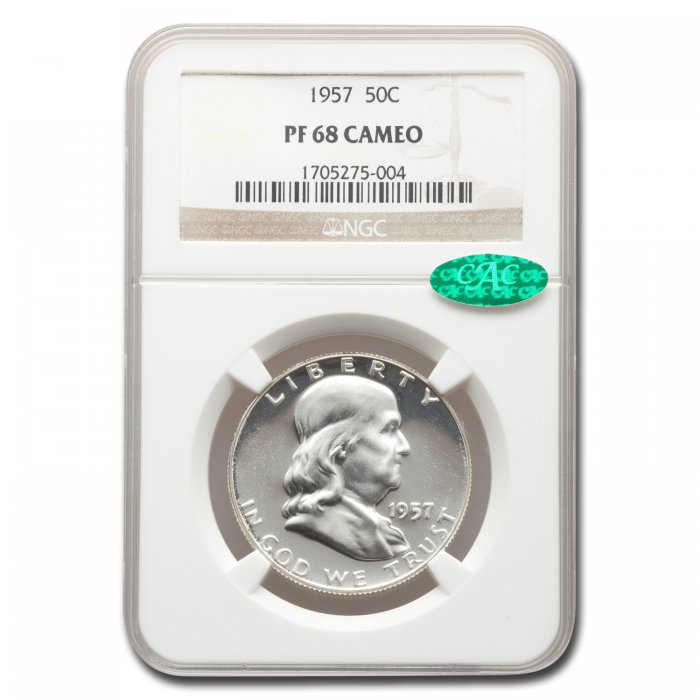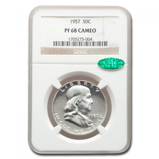 Only $424.99 per coin This 1957 Franklin Half Dollar has been certified as PF-68 Cameo by NGC, one of the top two coin grading services. This highly collectible coin is a great addition to any numismatic collection!