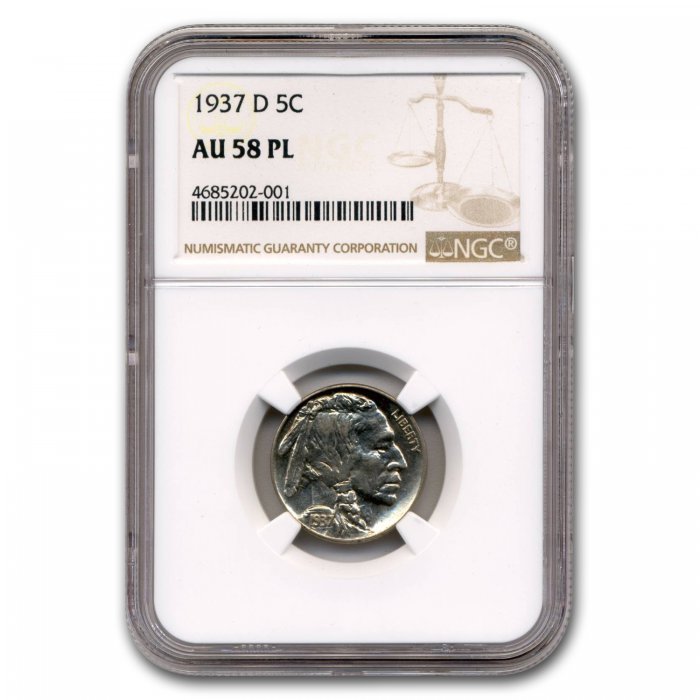 This 1937-D Buffalo Nickel has been certified as AU-58 (PL) by NGC, one of the top two coin grading services. This coin has a population of only 1 coin!