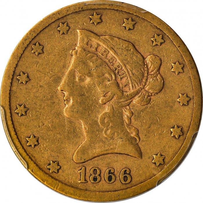 This 1866-S $10 Liberty Gold Eagle (No Motto) has been certified as VF-30 by PCGS, one of the top two coin grading services. This coin has a population of only 4 coins!